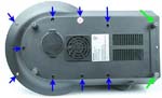 Next, remove the two rubber feet at the rear of the machine as indicated here by the green arrows. They are pressed into place and held by friction. Simply pull while "unscrewing" them and they will come out easily. Remove the 11 screws as indicated by all the arrows here. Note that there may be a sticker over one of the screw holes which needs to be removed to access the screw beneath it.