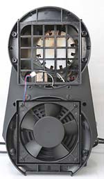 When replacing the fan push the wires and connector through the back of the machine, and place the wires as shown here. Be sure not to pinch the wires when replacing the fan. Hold the fan in place, be sure that it is aligned all the way around and that the wires are not pinched, and then loosely replace all for screws before tightening them. Do not over-tighten the screws!