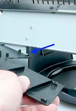 Remove the two screws behind the plugs and the side panel can be pulled away from the machine, freeing the cooling tray base from the machine. The arrow indicates the slot and tab that held the Tray base in place.